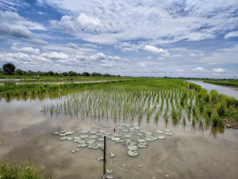 Kondisi lahan yang tergenang air cukup optimal menunjukkan kesiapan alam dalam mendukung pertumbuhan bibit padi yang baru saja ditanam. Penyuluh swadaya hadir mendampingi petani untuk memberikan arahan teknis serta memastikan pola tanam yang dilakukan sesuai dengan anjuran agar hasil panen nantinya dapat maksimal.